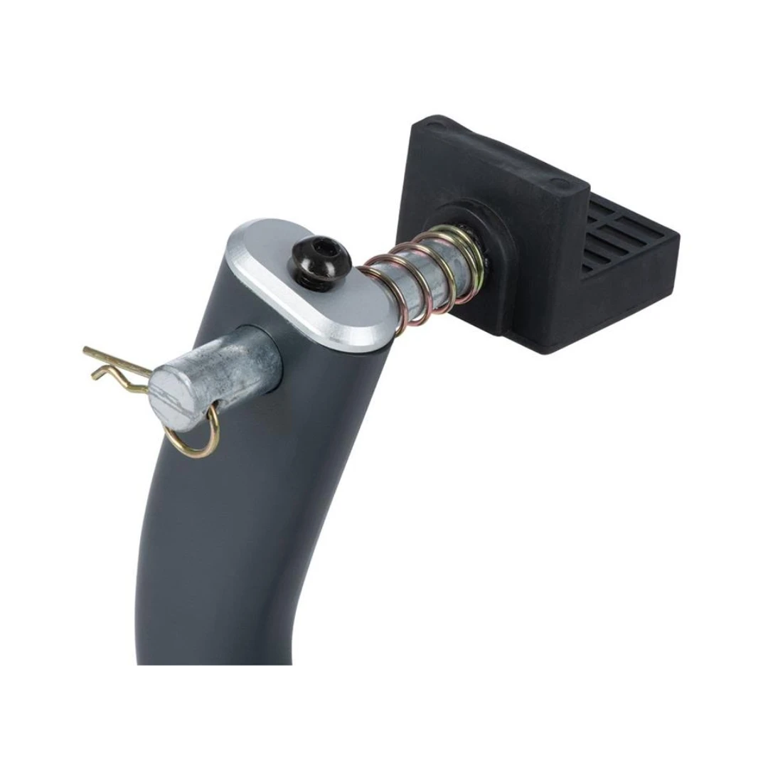 Forma tip L permite sprijinirea directă pe basculă (swingarm), oferind stabilitate în timpul operațiunilor de întreținere precum lubrifierea lanțului, schimbarea roții sau intervenții la sistemul de frânare.