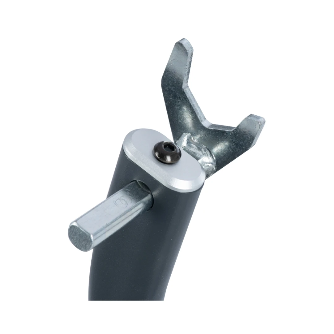 Designul tip V permite o fixare sigură și centrare precisă pe rolele/bobinele spate, facilitând operațiuni precum întreținerea lanțului, schimbarea roții sau lucrări de service.
