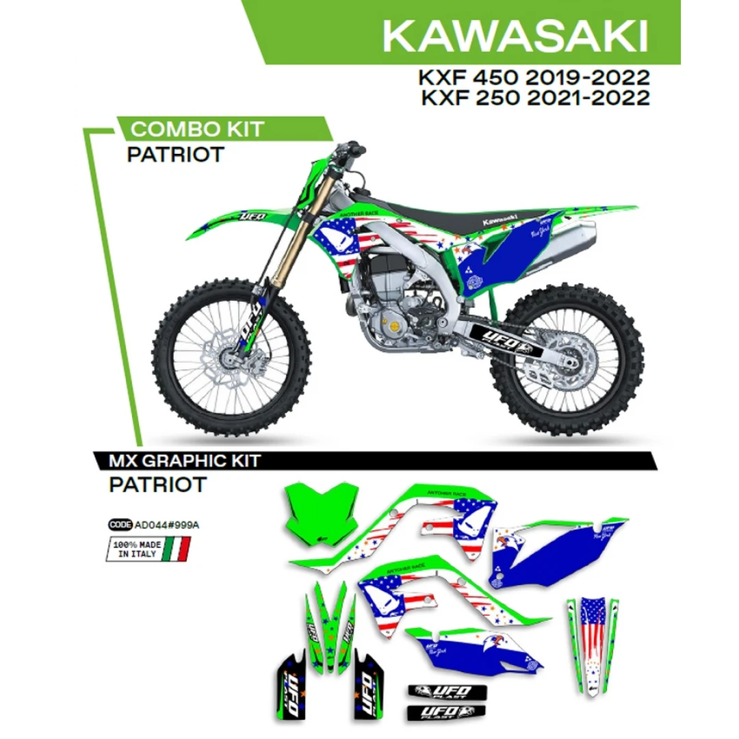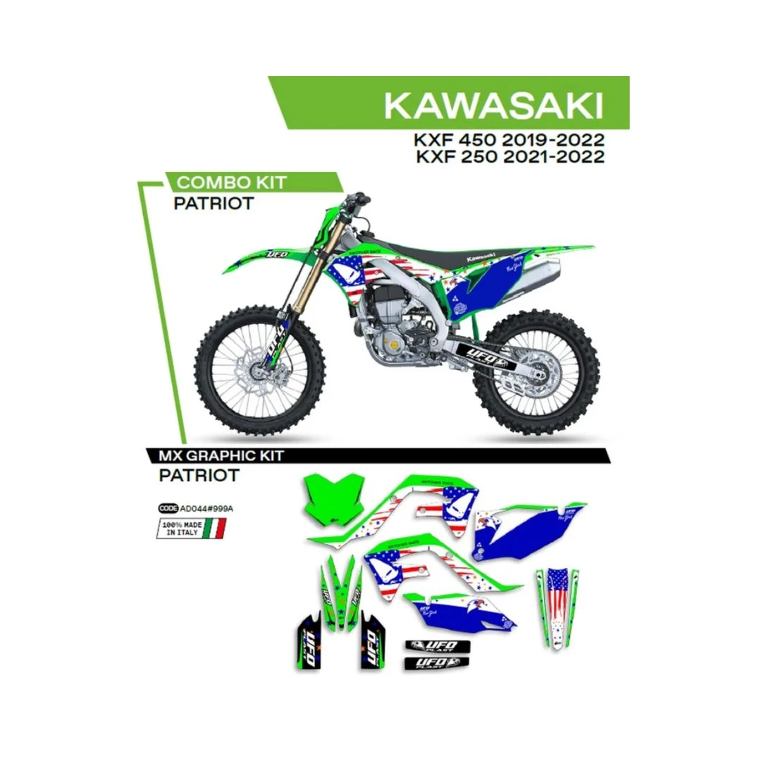 Kit grafic UFO KAWASAKI KXF 250 '21-'22; KXF 450 '19-'22 PATRIOT culoare OEM (Verde/Albastru) citește toată descrierea