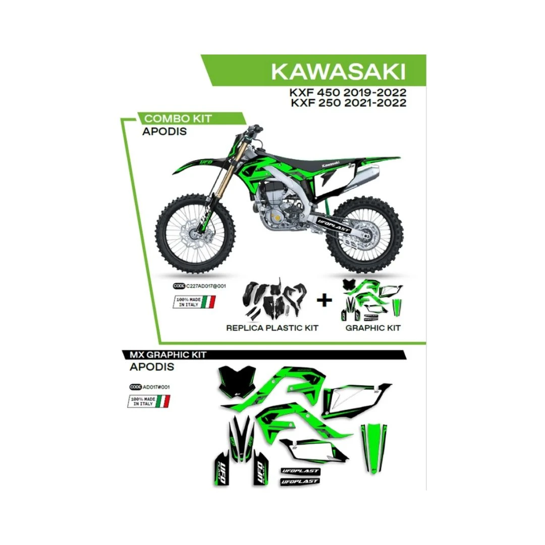 Kit complet plastice UFO KAKIT227001 include Stickere KAWASAKI KXF 250 '21-'22; KXF 450 '19-'22 (KA04738) si capace de amortizare (KA04701) APODIS culoare Negru