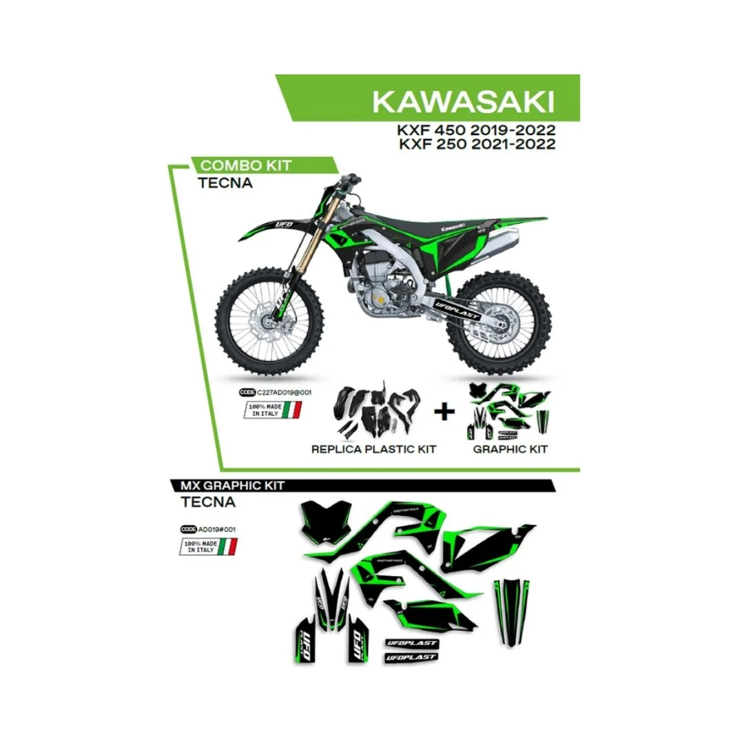Kit complet plastice UFO KAKIT227001 include Stickere KAWASAKI KXF 250 '21-'22; KXF 450 '19-'22 (KA04738) si capace de amortizare (KA04701) TECNA culoare Negru