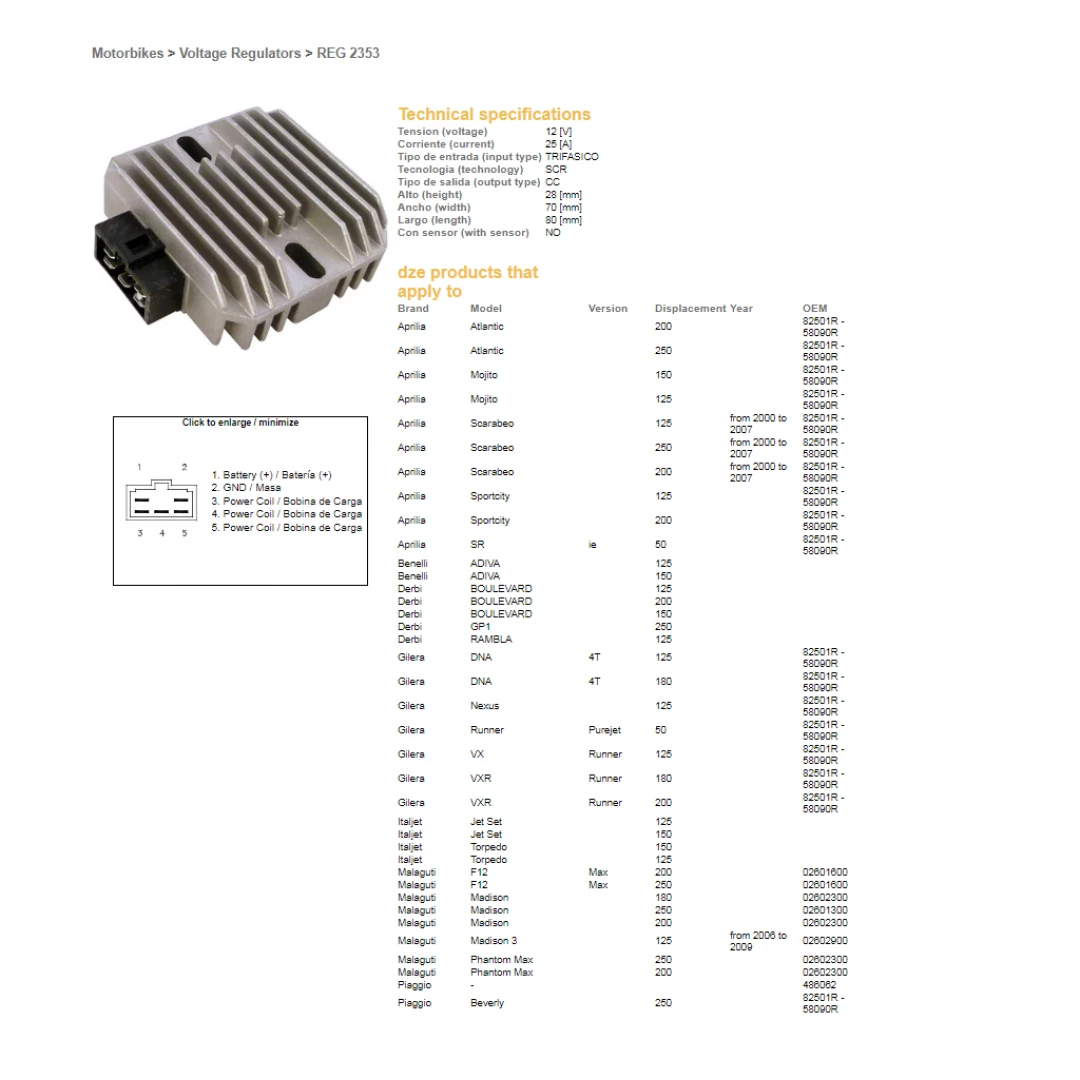 Regulator tensiune DZE APRILIA 125/250, MALAGUTI 125/200/250, PIAGIO 125/200/250 (12V/25A) (ESR259) citește toată descrierea