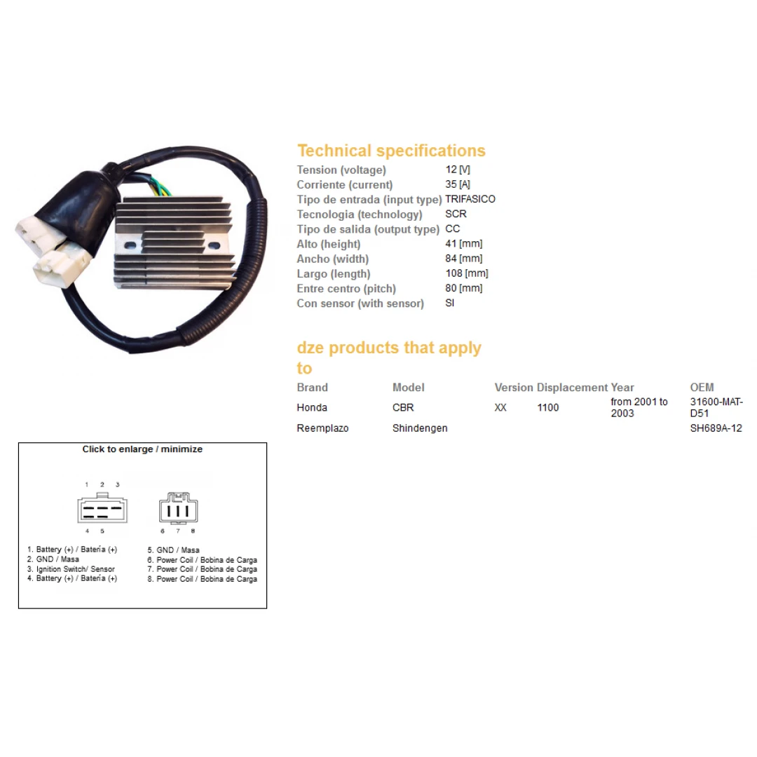 Regulator tensiune DZE HONDA CBR 1100 XX '01-'03 (SH689A-12) (31600-MAT-D51) (ESR685) citește toată descrierea