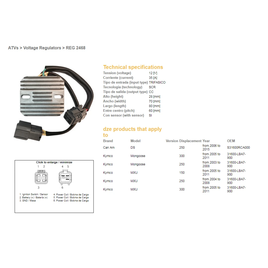 Regulator tensiune DZE KYMCO MXU 150/250/300 '04-'11, CAN AM DS 250 '06-'15 12V 35A (31600-LBA7-900) (ESR344) citește toată descrierea