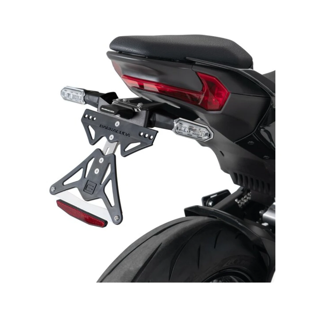 Kitul Barracuda pentru număr de înmatriculare, proiectat special pentru Kawasaki Z900 (2025), oferă o soluție premium, robustă și elegantă, ideală pentru cei care vor să îmbunătățească estetica motocicletei păstrând, în același timp, compatibilitatea cu semnalizatoarele originale. Realizat prin tăiere laser de înaltă precizie, suportul combină aluminiul eloxat negru cu elemente din plastic dur și componente din oțel inoxidabil pentru ajustare, asigurând durabilitate și stabilitate pe termen lung.
