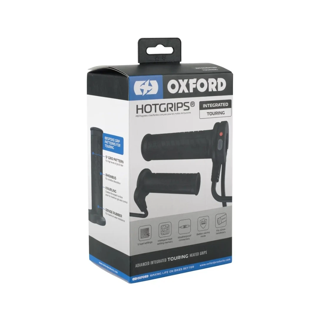 Manșoanele încălzite Oxford Products Advanced Integrated HotGrips® Touring sunt concepute pentru motocicletele de touring și pentru riderii care parcurg distanțe lungi în orice sezon. Controllerul slim, integrat direct lângă manșon, permite ajustarea temperaturii fără a lua mâna de pe ghidon, oferind un design curat, de tip OEM, fără unitate externă montată separat.