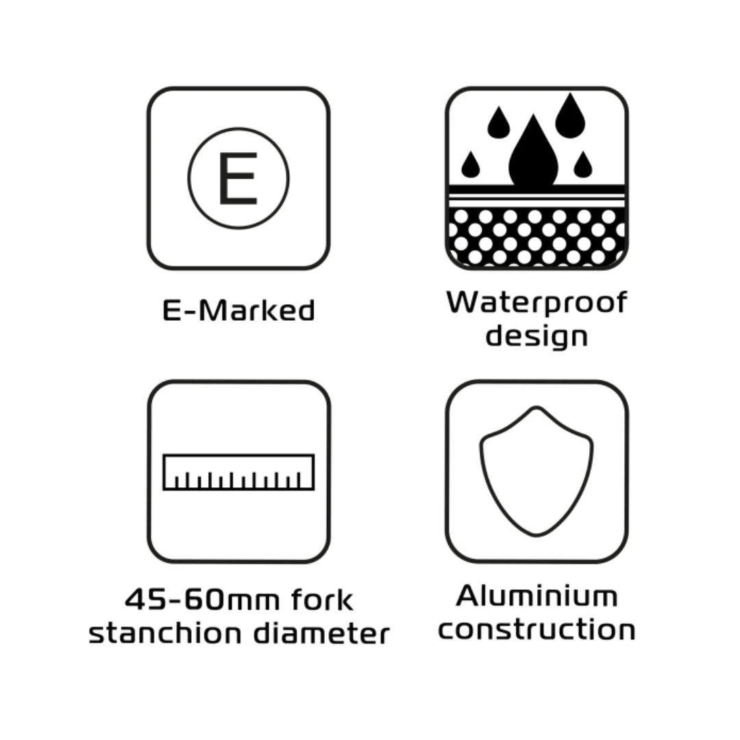 Fabricate din aluminiu CNC de înaltă calitate, sunt rezistente la apă și aprobate E-mark, fiind complet legale pentru utilizare pe drumurile publice. Aceste semnalizatoare sunt soluția ideală pentru cei care doresc să își mute semnalizatoarele pe furcă și să beneficieze de o vizibilitate optimă, chiar și în condiții de lumină scăzută sau vreme nefavorabilă.