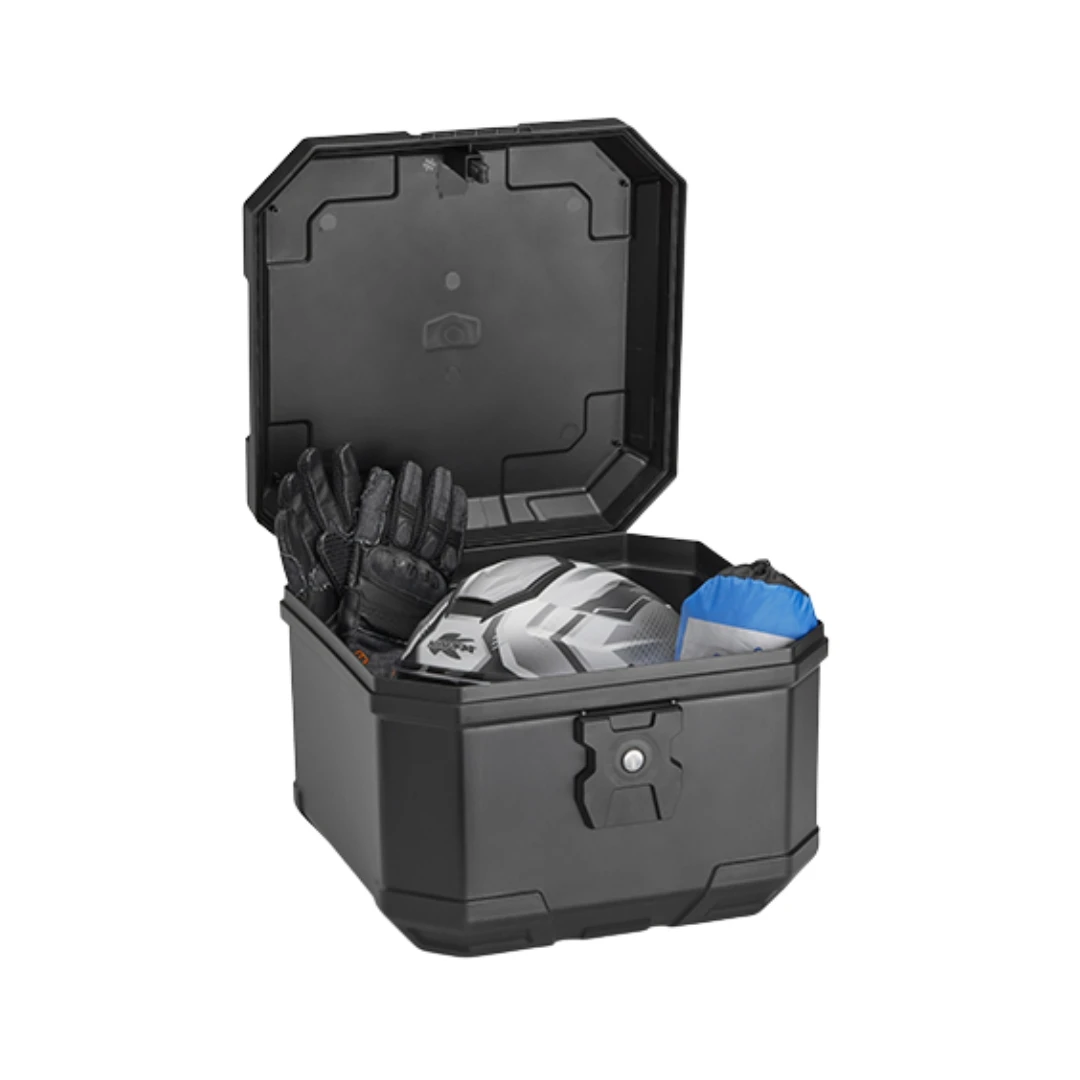 Designul său compact și funcțional se integrează ușor pe orice tip de motocicletă sau scuter. Sistemul de închidere CRABLOCK permite o utilizare rapidă și intuitivă: prin rotirea cheii, capacul se ridică automat, oferind acces imediat la interior. Sistemul de eliberare rapidă cu buton intern permite detașarea top case-ului de pe placă doar cu capacul deschis, prevenind desprinderea accidentală în timpul mersului.
