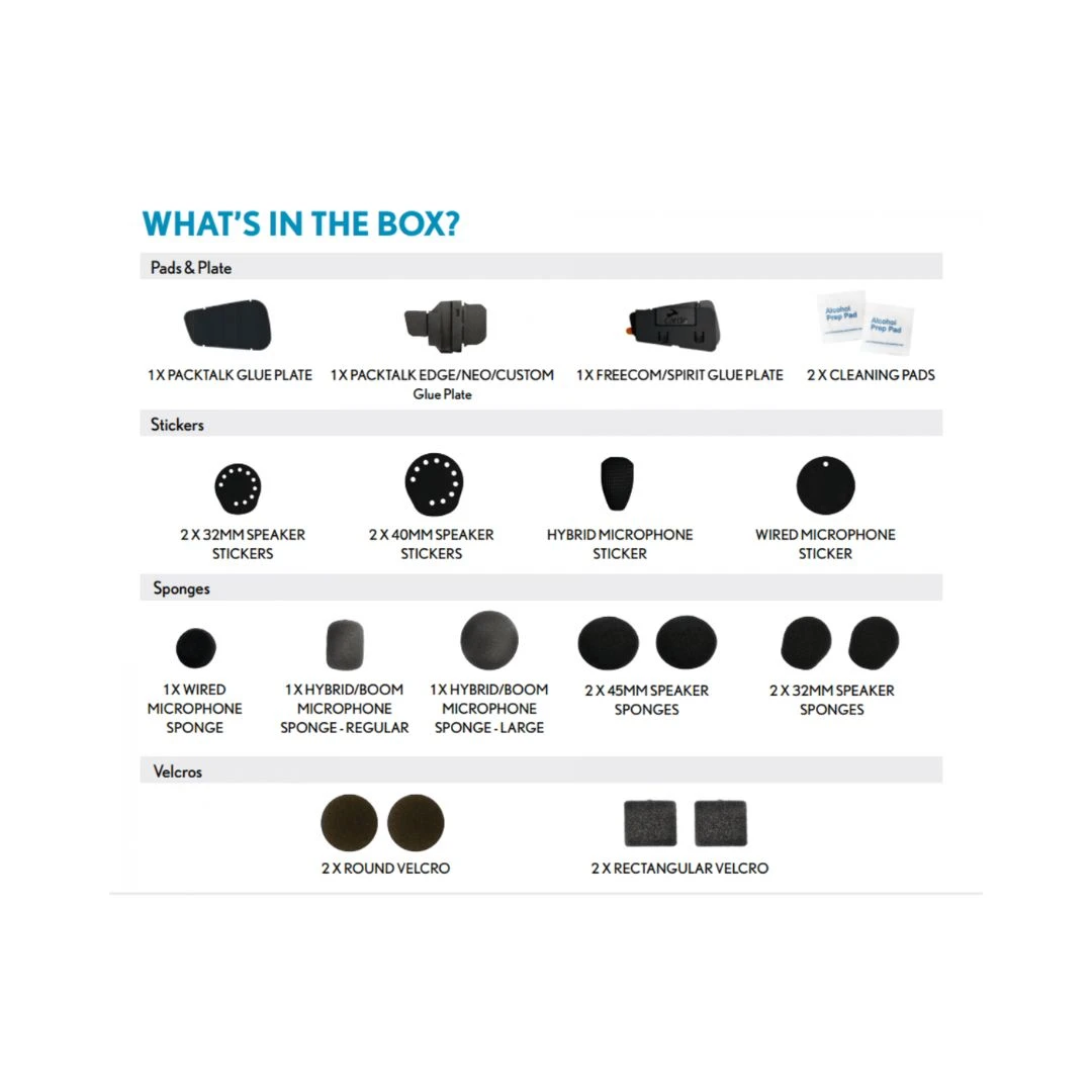 - Tampoane și plăci: 2x tampoane de curățare; 1x placă de lipire Freecom; 1x placă de lipire Packtalk