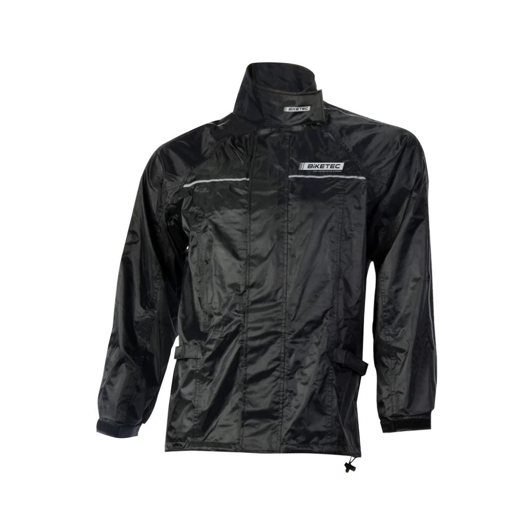 Geaca de ploaie BIKETEC este confecționată din nylon 100% impermeabil, oferind protecție optimă în condiții de umiditate. Cu o culoare neagră elegantă și inserții reflectorizante pentru vizibilitate îmbunătățită, aceasta este echipată cu manșete elastice la mâneci și un fermoar lung, ascuns sub materialul impermeabil pentru a preveni pătrunderea apei.