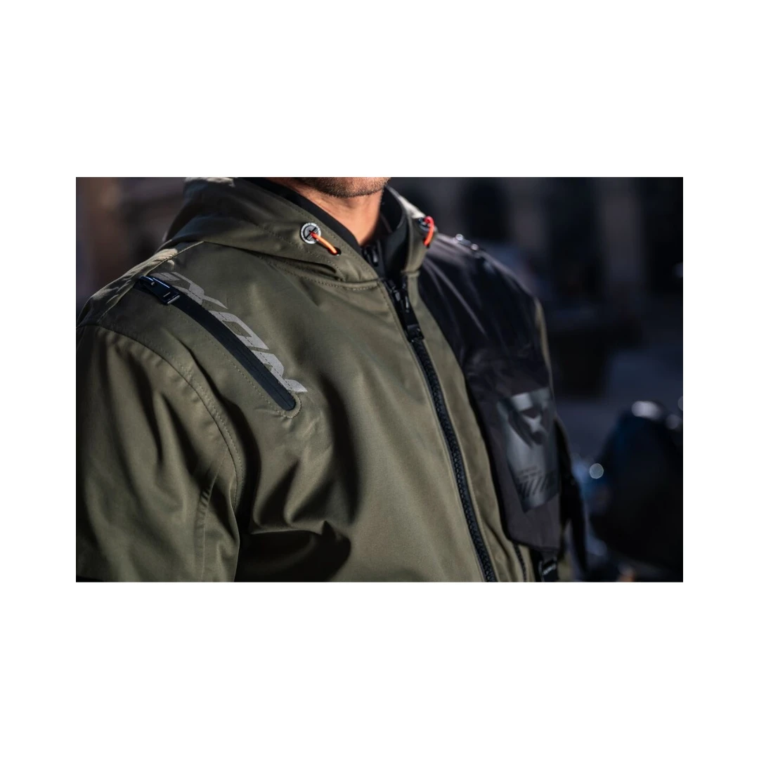 Designul său inspirat din techwear urban combină funcționalitatea cu estetica modernă, oferind libertate de mișcare excelentă și o protecție optimă împotriva vântului și ploii. Este o geacă laminată pe exterior, ceea ce înseamnă că stratul waterproof este integrat direct în materialul exterior – fără nevoie de căptușeli suplimentare.