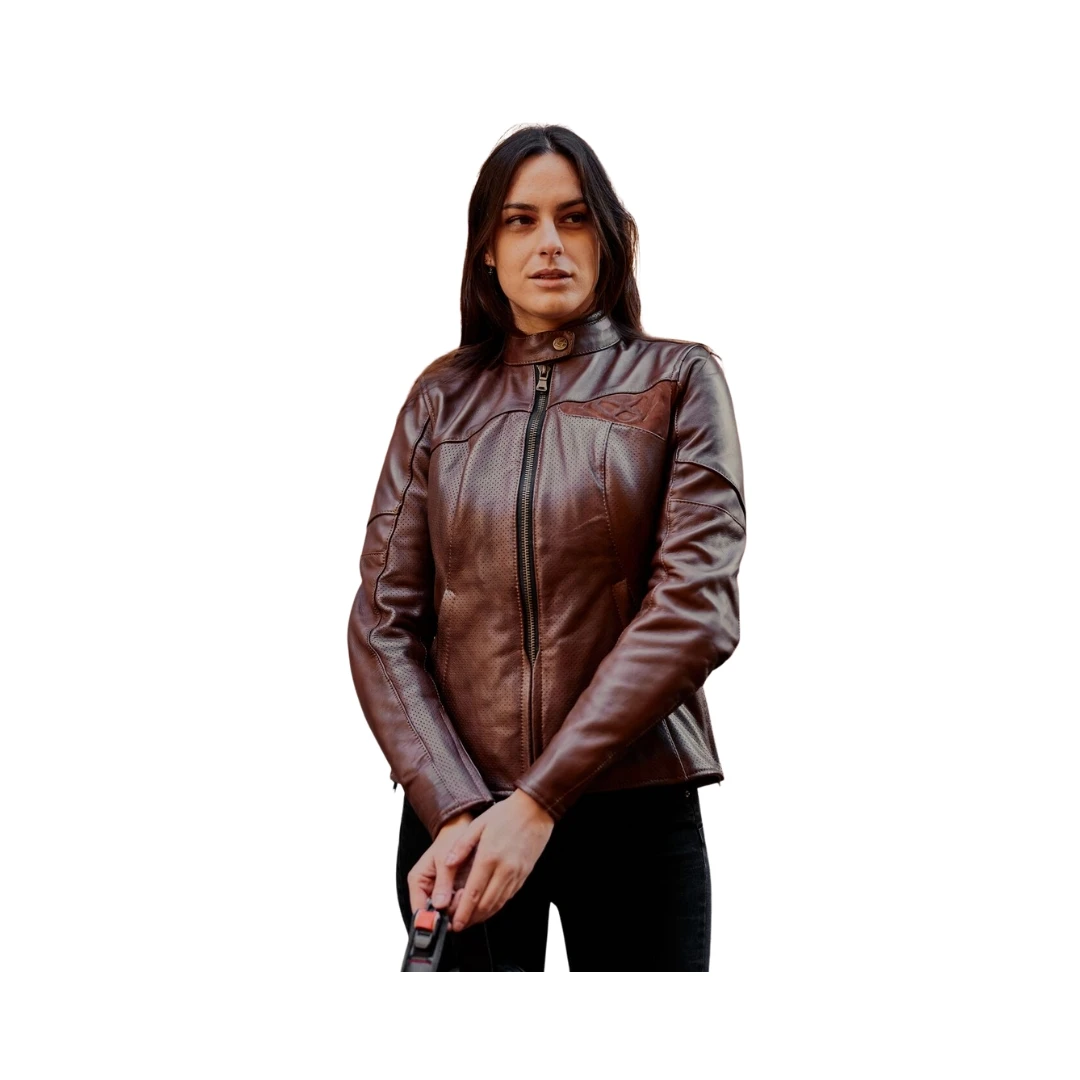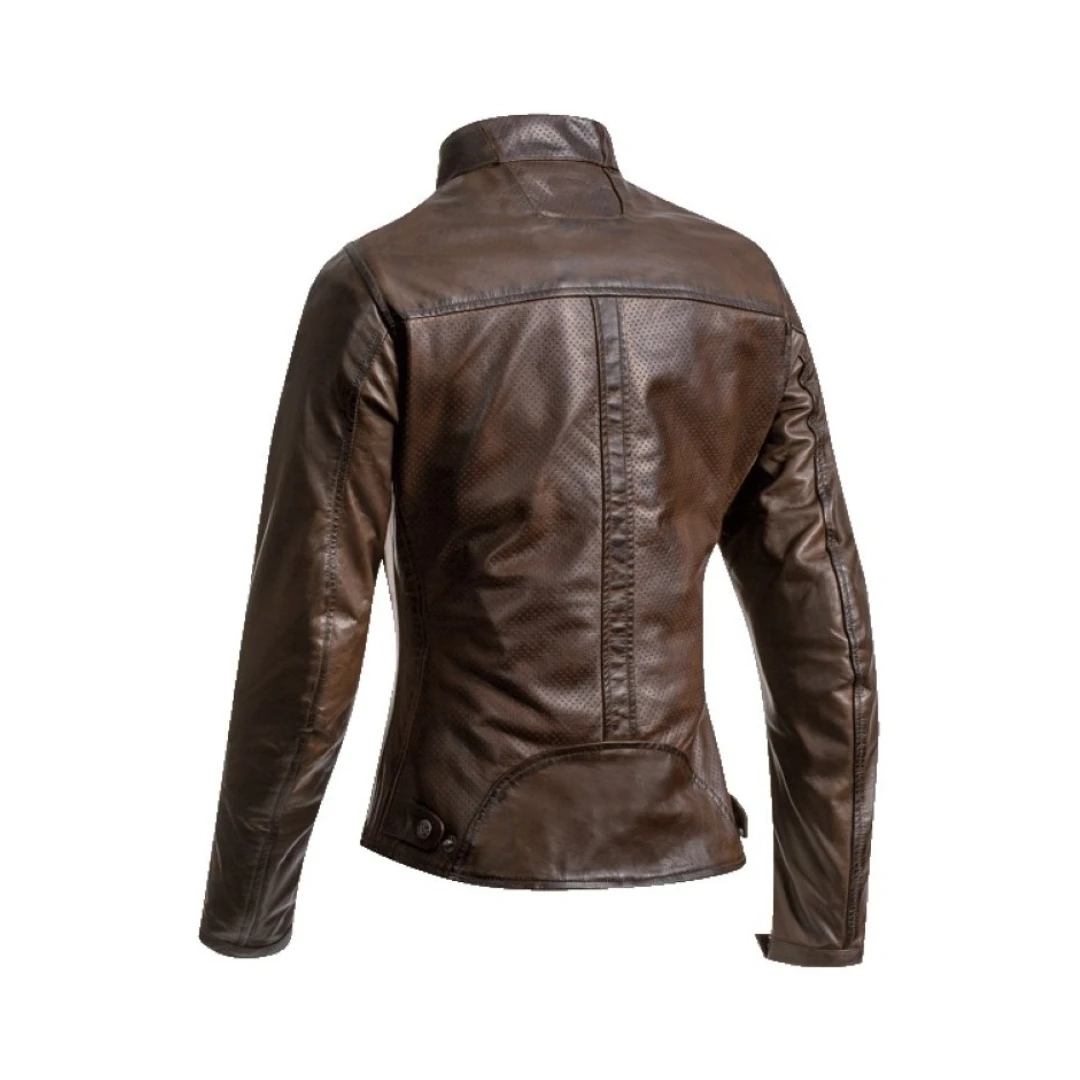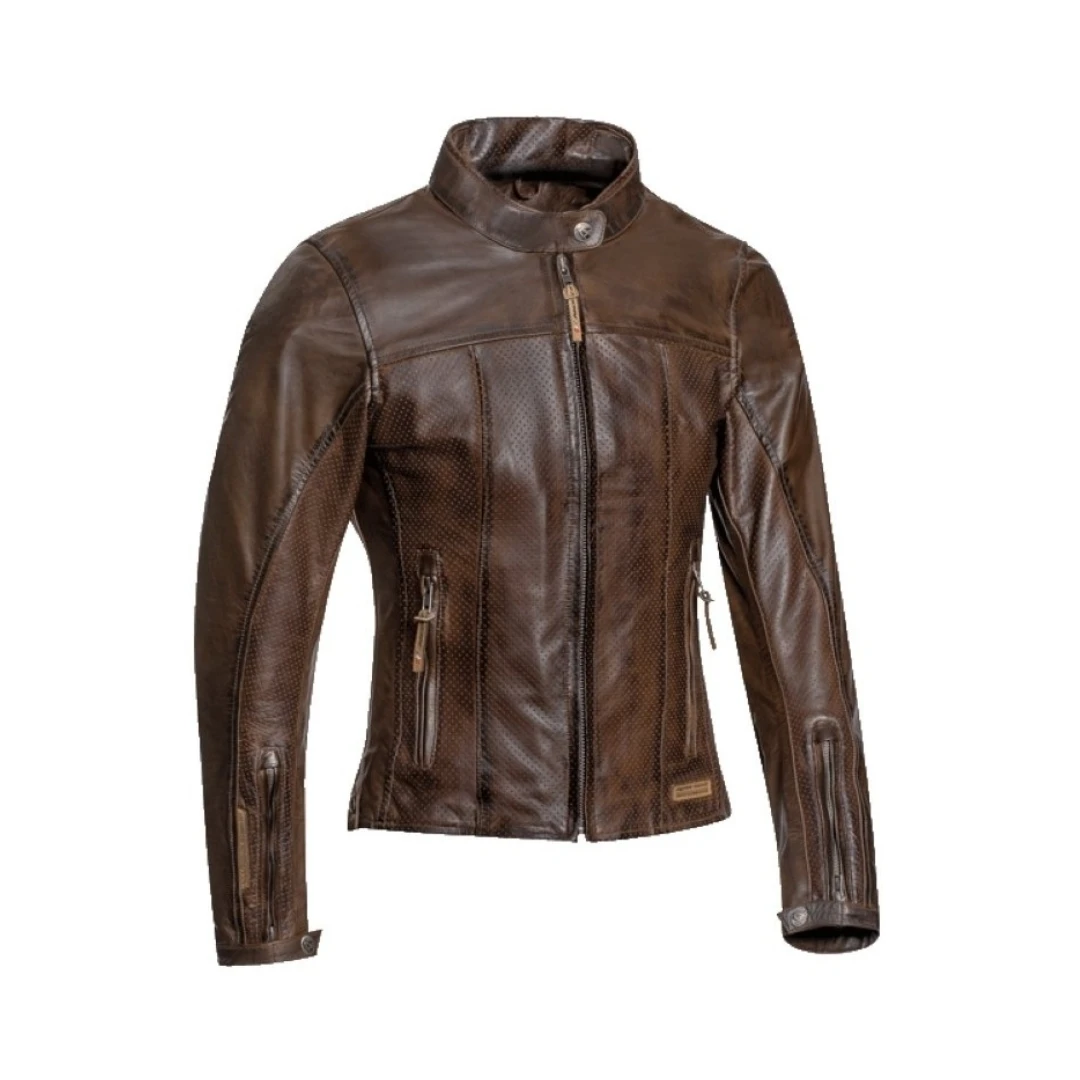 Geacă moto femei Ixon Crank Air LS – vară, Urban/Heritage, piele maro. Jachetă din piele perforată, ventilată, cu protecții CE Fanom® la umeri și coate. Stil vintage, confort modern și siguranță în oraș.